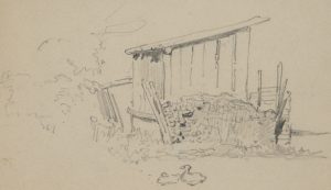 B. BURGER (1892-1968) zug., Ländliche Skizze mit Hütte u. Enten, um 1900, Bleist