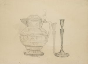 A. SCHMIDT (20.Jhd), Skizze einer silbernen Kanne und Kerzenständer, Bleistift