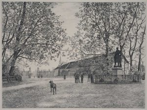 A. LARSEN (1856-1942), Frühlingstag im Park, Flaneure, Denkmal, um 1901, Rad.