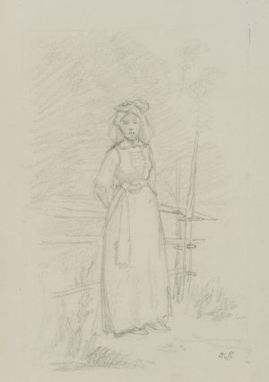 E. RONDAHL (1858-1914), Porträt einer Magd am Holzzaun, 1883, Bleistift