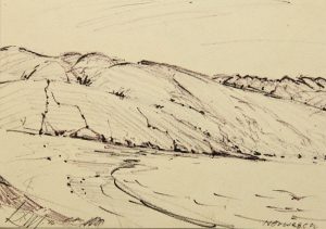 R. MÜLLER-ALSFELD (*1905), Hügellandschaft mit Küstenstreifen in Norwegen, 1974