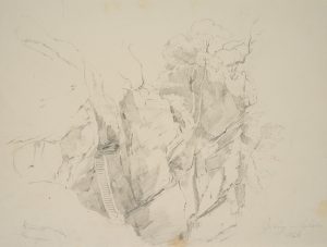 Unbekannt (19.Jhd), Schlucht mit Bachlauf, 1858, Bleistift Romantik Natur