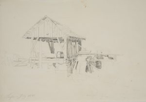 T. WEBER (1813-1875), “Butzeralpe” im August, Gehöft am Fluss,, 1841, Bleistift