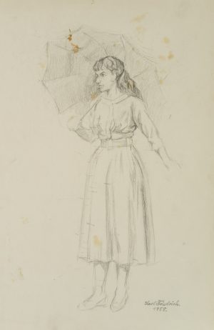 K. FRIEDRICH (20.Jhd), Frau im Kleid mit Regenschirm, 1958, Bleistift Moderne