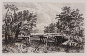 A. PENNAUTIER (*1803), Vegetationsreiche Landschaft mit Holzbrücke, Rad.