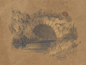 Unbekannt (19.Jhd), Bachlauf unter gemauertem Bogen, Bleistift Romantik