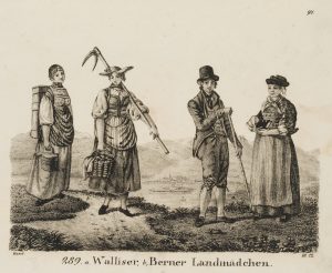 Unbekannt (19.Jhd), ‘Walliser, Berner Landmädchen, um 1830, Realismus Trachten