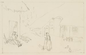 Unbekannt (19.Jhd), Hofansicht mit Bauer und Frau, Tirol, Bleistift Romantik