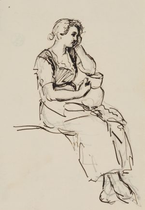 Unbekannt (19.Jhd), MEYER-BREMEN, Portraitskizze. Magd sitzend mit Krug.,