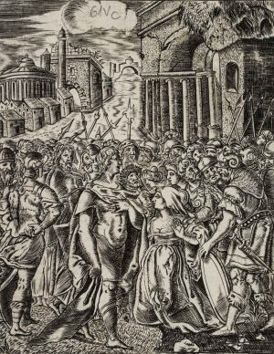 Unbekannt (17.Jhd), Bibl. Historienszene, Menge um Jüngling u Frau, Barock