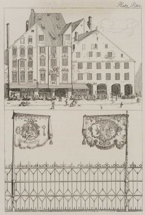 F. BOLLINGER (19.Jhd), Altes Rathaus von der Peterskirche, vor 1820, Rad.