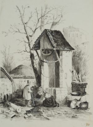 K. HOOG (19.Jhd), Dorfbewohner vor dem Brunnen, 1841, Romantik Stadtbilder