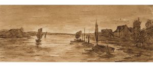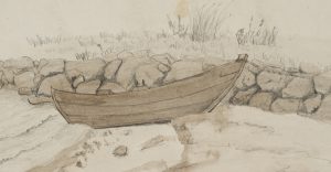 E. RONDAHL (1858-1914), Landschaftsstudie, Boote am Wasser, 1880, Bleistift