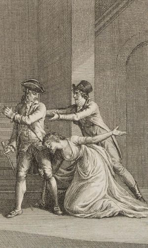 Unbekannt (18.Jhd), Flehendes Paar bei einem Herren, Radierung Rokoko
