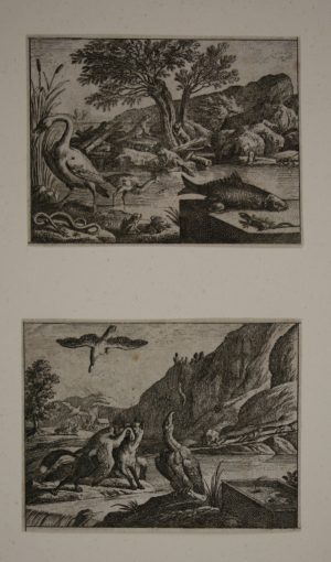 Unbekannt (18.Jhd), Füchse Vögel Biber, 2 Bl., um 1780, Rad. Klassizismus Tiere