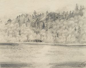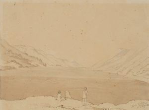 Unbekannt (19.Jhd), Seenlandschaft, Flaches Ufer mit ferner Hügelkette, Bleistif