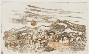 I. HELSPER-CHRISTIANSEN (*1942), Stadtlandschaft vor Gebirgszug, Radierung