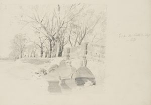 R. PÜTTNER (1842-1913), PÜTTNER, Landschaftsskizze. Alte Steinbrücke mit Straßen