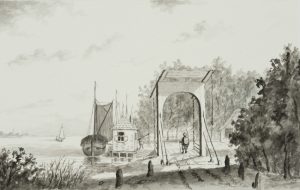Unbekannt (19.Jhd), Zugbrücke an holländischem Kanal, Romantik Architektur