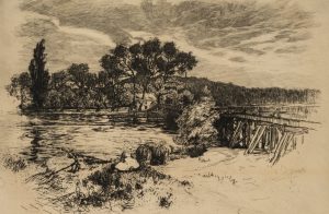 H. WILCKY (20.Jhd), Mädchen am Fluss, Radierung Moderne Landschaft