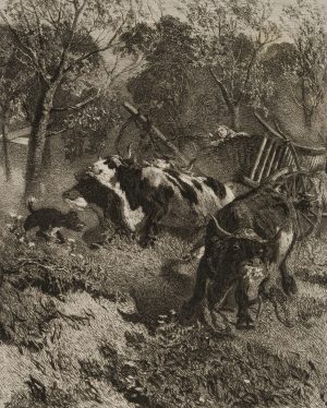 KLAUS (*1847) nach SCHMITSON (*1830), Scheuende Ochsen, um 1870, Rad. Realismus