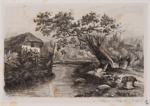 A. PENNAUTIER (*1803), Hütte am Fluss mit Flussüberquerung, Radierung Romantik