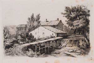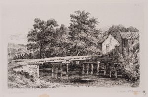 A. PENNAUTIER (*1803), Fluss mit Brücke undGehöft, Aspet, Radierung Romantik