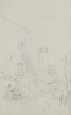 T. WEBER (1813-1875), Zwei Landfrauen in Bergdorf, Bleistift Romantik Architektu