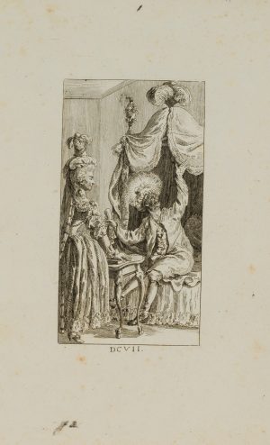 B. DUNKER (1746-1807), Mann mit Nimbus und Hofdame, um 1780, Radierung Rokoko