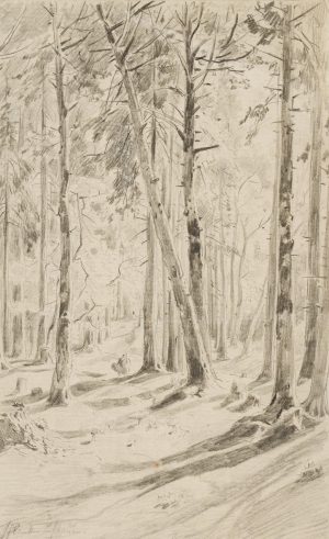 R. PÜTTNER (1842-1913), PÜTTNER, Waldstück mit Wandersfrau beim Pilzesammeln.,