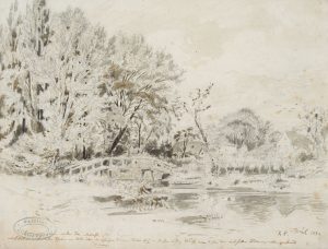 A. PENNAUTIER (*1803), Vegetationsreiche Landschaft mit Holzbrücke, Rad.