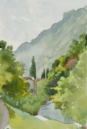 A. PENNAUTIER (*1803), Fluss mit Brücke undGehöft, Aspet, Radierung Romantik