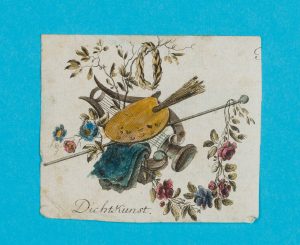 Unbekannt (19.Jhd), Dichtkunst’, Blumenarrangement mit Lyra und Malpalette, um 1