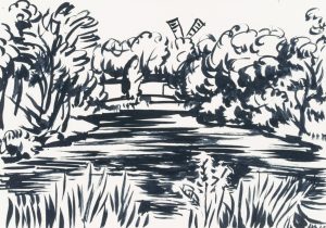 H. WINGLER (1896-1981), See mit vegetationsreichem Ufer und Windmühle, 1962,