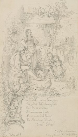 F. BALZER (1872-1916), Mutter beim Häkeln mit spielenden Kindern, um 1900, Feder