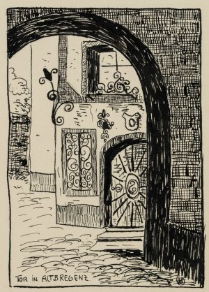 Monogramm WH (19.Jhd), Gasse und Tor in Altbregenz im Vorarlberg, Feder
