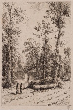 L. MARVY (19.Jhd), Waldarbeiter am Waldweg bei Häusern, um 1844, Radierung