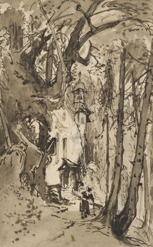 R. PÜTTNER (1842-1913), PÜTTNER, Tuscheskizze v. Kirche im Wald u. Bleistiftski