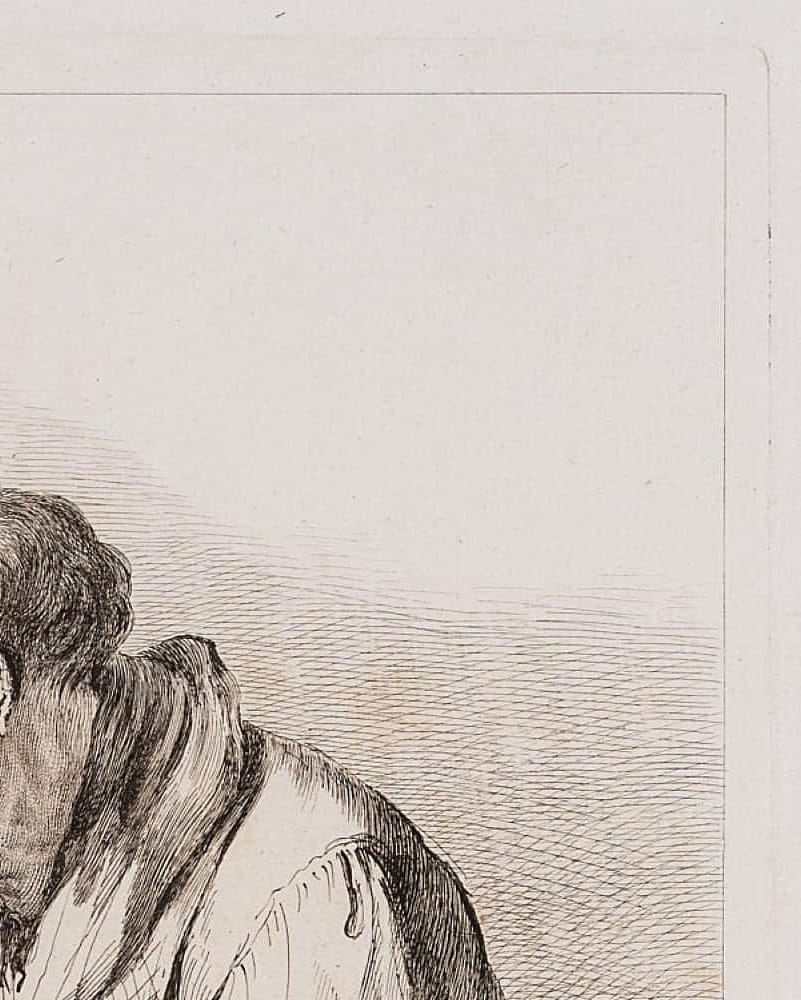 • Condition: Good condition. The sheet is foxed in places. The image is freshly preserved and makes a perfect impression. The edges of the sheet are untrimmed and bumped. There are some short marginal tears along the right and left edge of the sheet. Pale liquid stain at lower left and a small hole in the paper. There is a coarse tear on the centre right margin of the sheet.