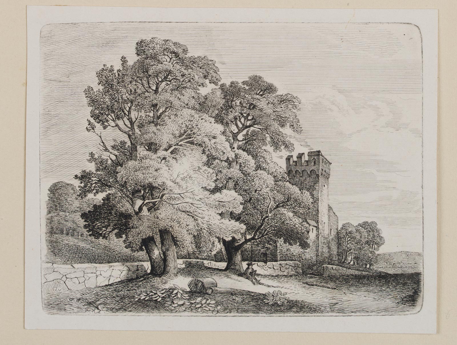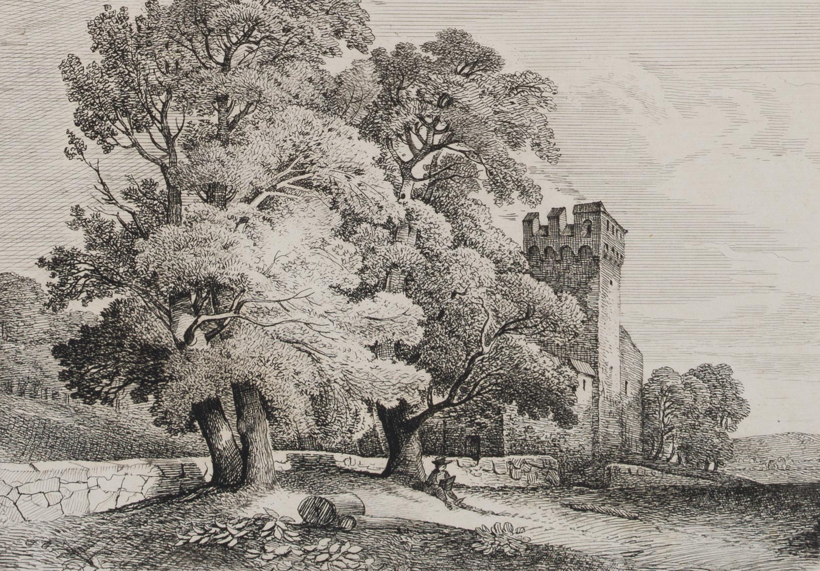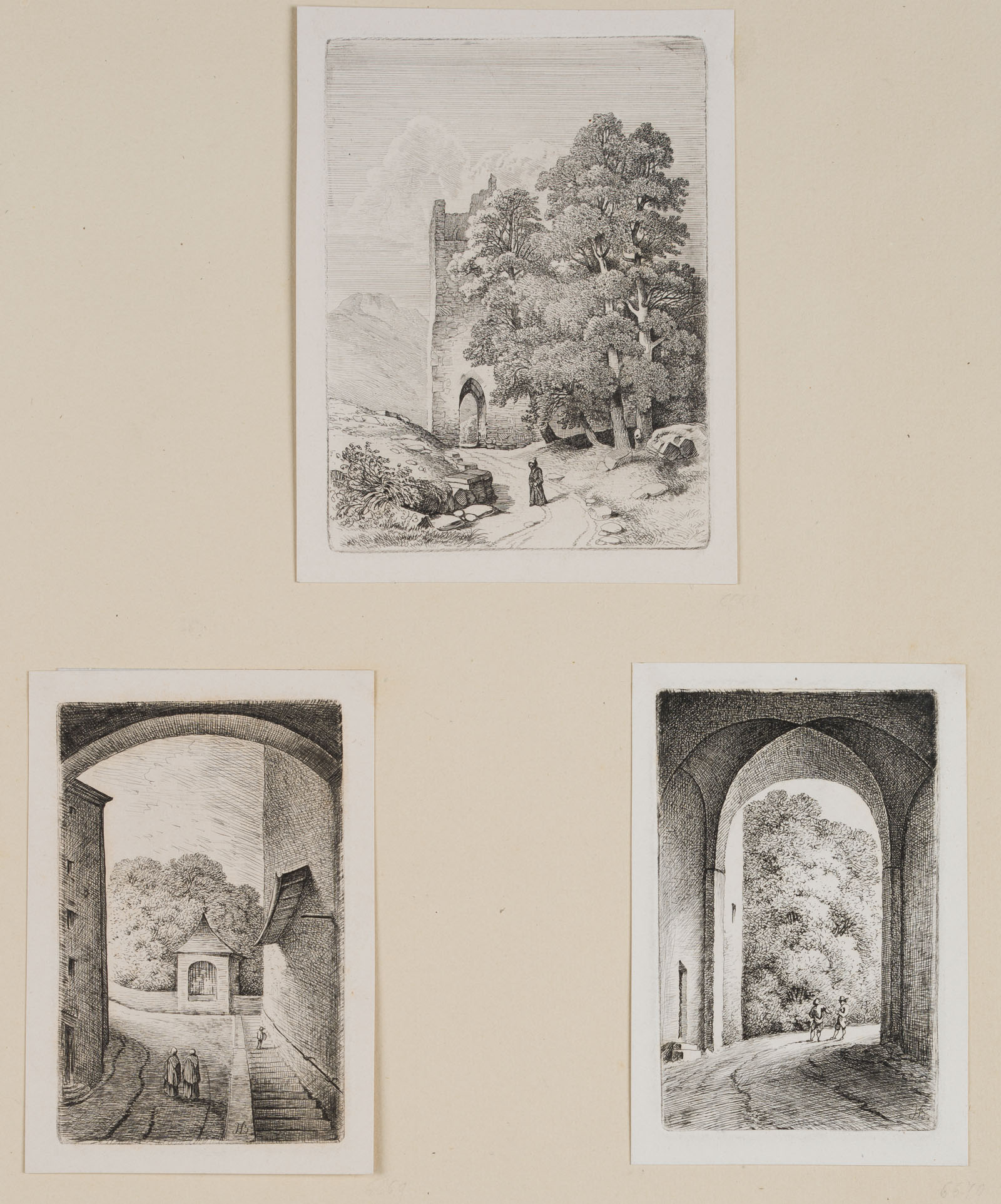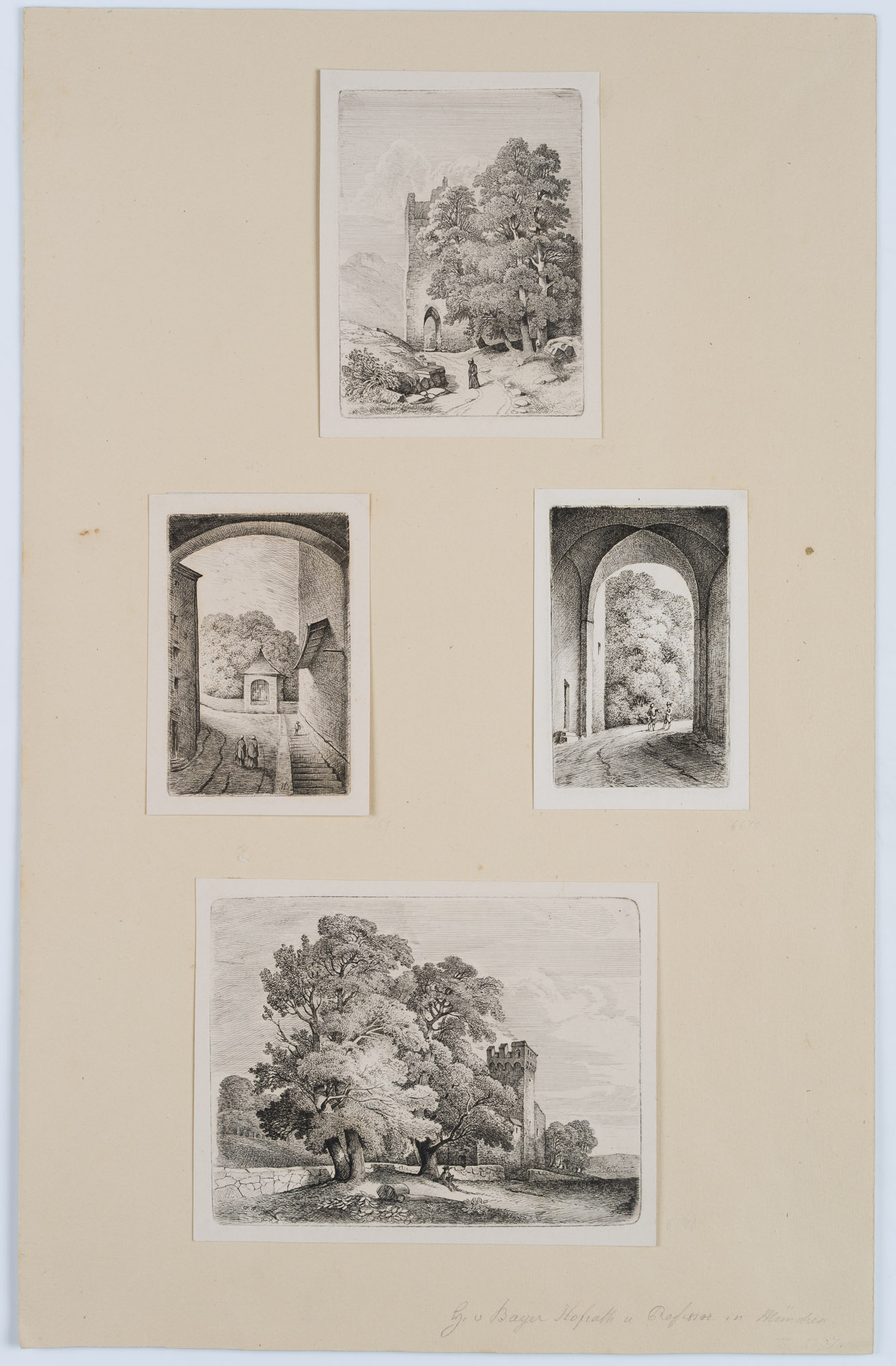 August von Bayer (1803 Rorschach – 1875 Karlsruhe), Impressions of Old Buildings in the Landscape, Four Copper Engravings, 19th century, Copper engraving