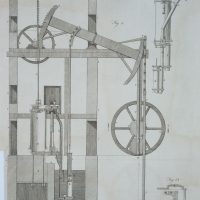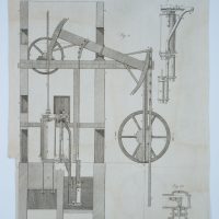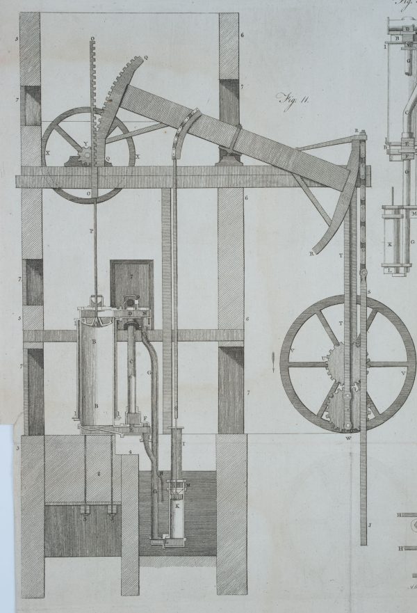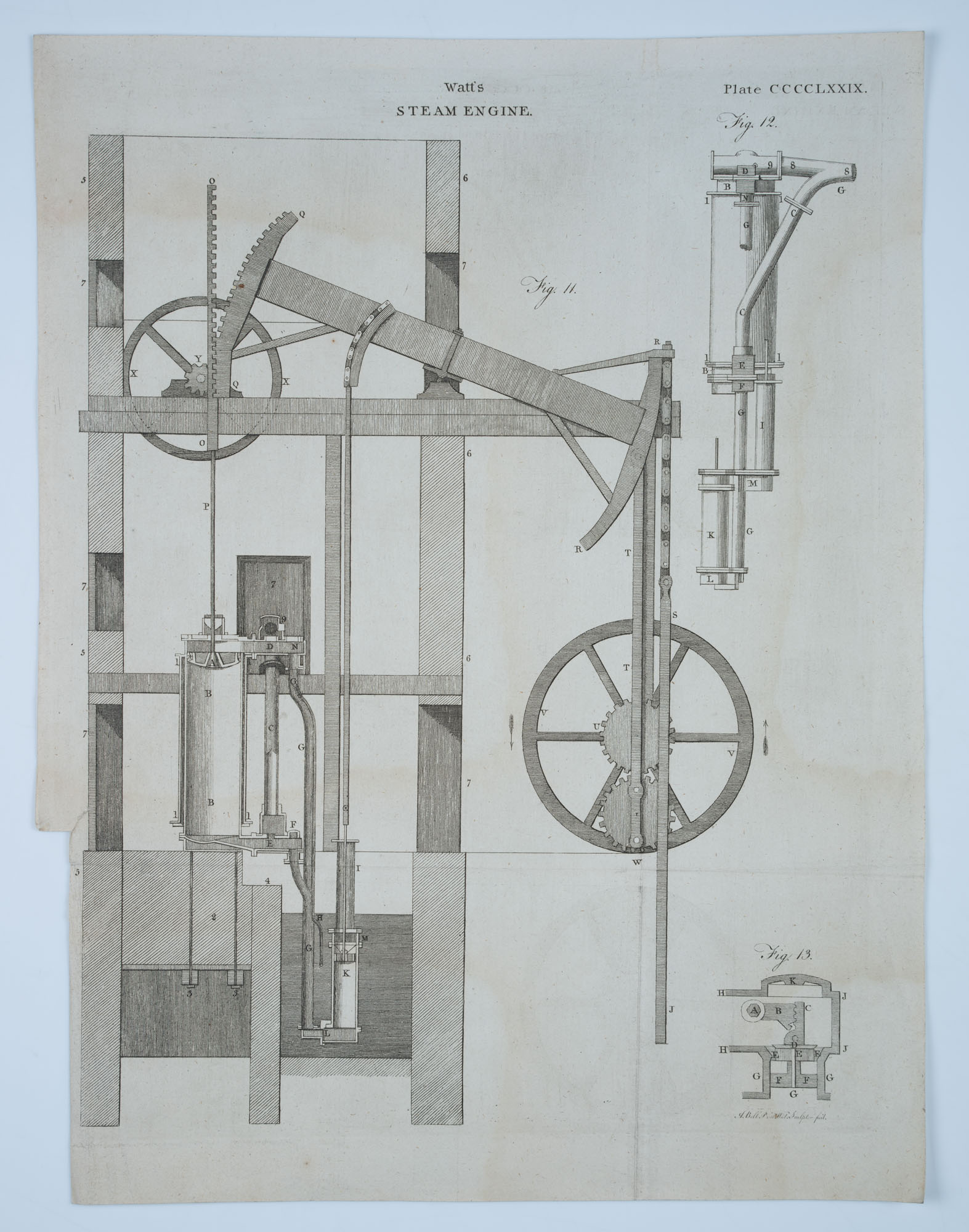 - Beschreibung: Das Blatt zeigt ein Modell der James Watt Dampfmaschine, sowie 2 weitere Detailfiguren. Unten rechts signiert mit “A. Bell Pin Wat Sculpter fecit.”.