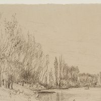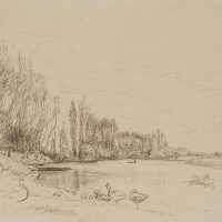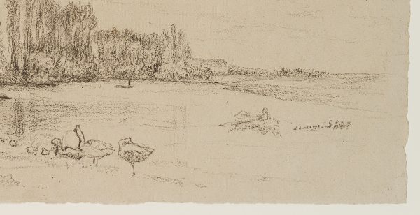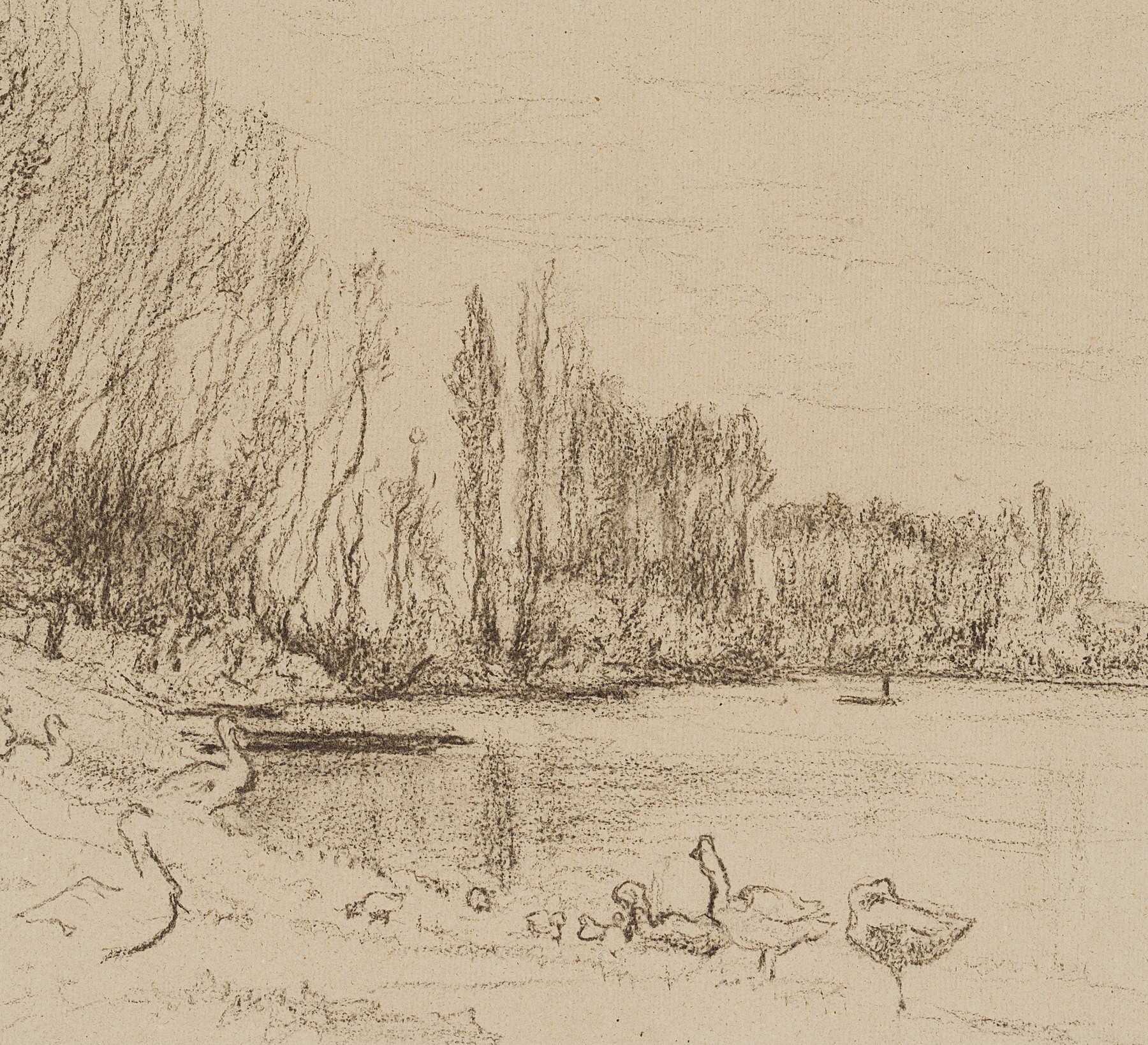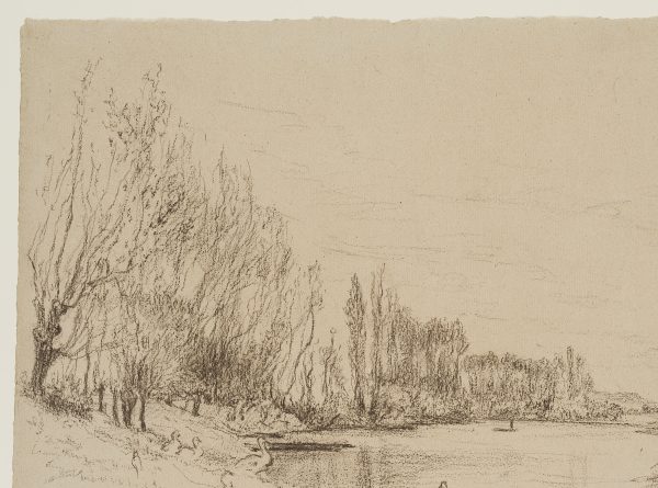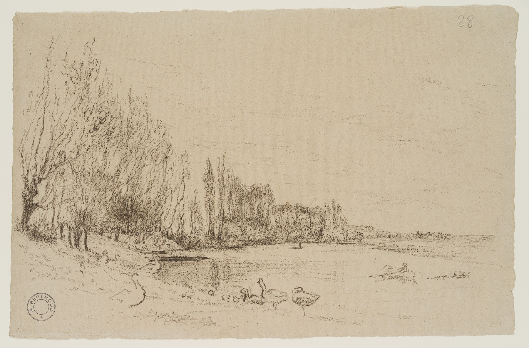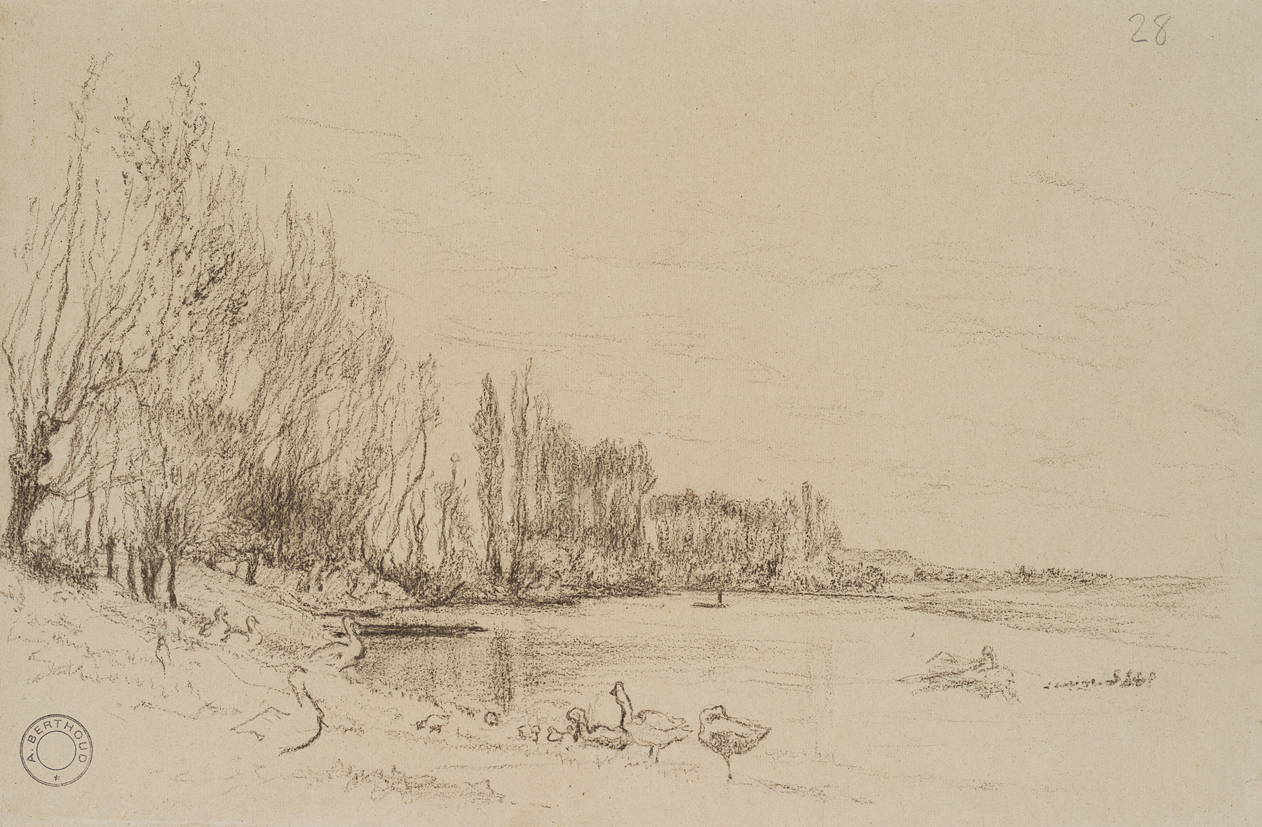 Auguste-Henri Berthoud (1829 Paris – 1887 Neuchâtel), French Lake Landscape with Geese and Swans, c. 1850, Charcoal