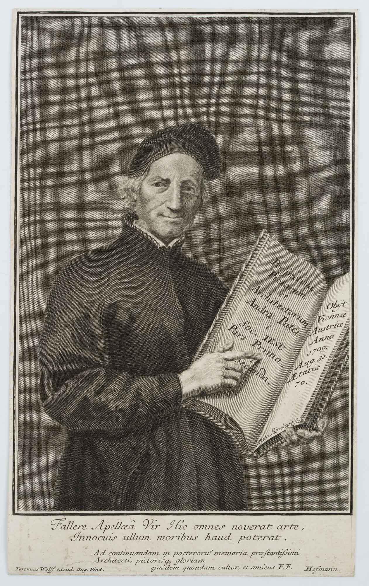- Description: The book that the sitter presents to the viewer is the publication ‘Perspectiva Pictorum’ written by him. Inscribed below the image. Inscribed with the name of the publisher on the lower left margin: “Jeremias Wolff excud. Aug. vind.”.