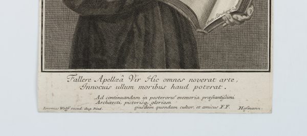 - Beschreibung: Das Buch, das der Porträtierte dem Betrachter präsentiert ist die von ihm verfasste Publikation ‘Perspectiva Pictorum’. Unter der Darstellung beschriftet. Am Blattrand unten links mit dem Namen des Herausgebers beschriftet: “Jeremias Wolff excud. Aug. vind.”.