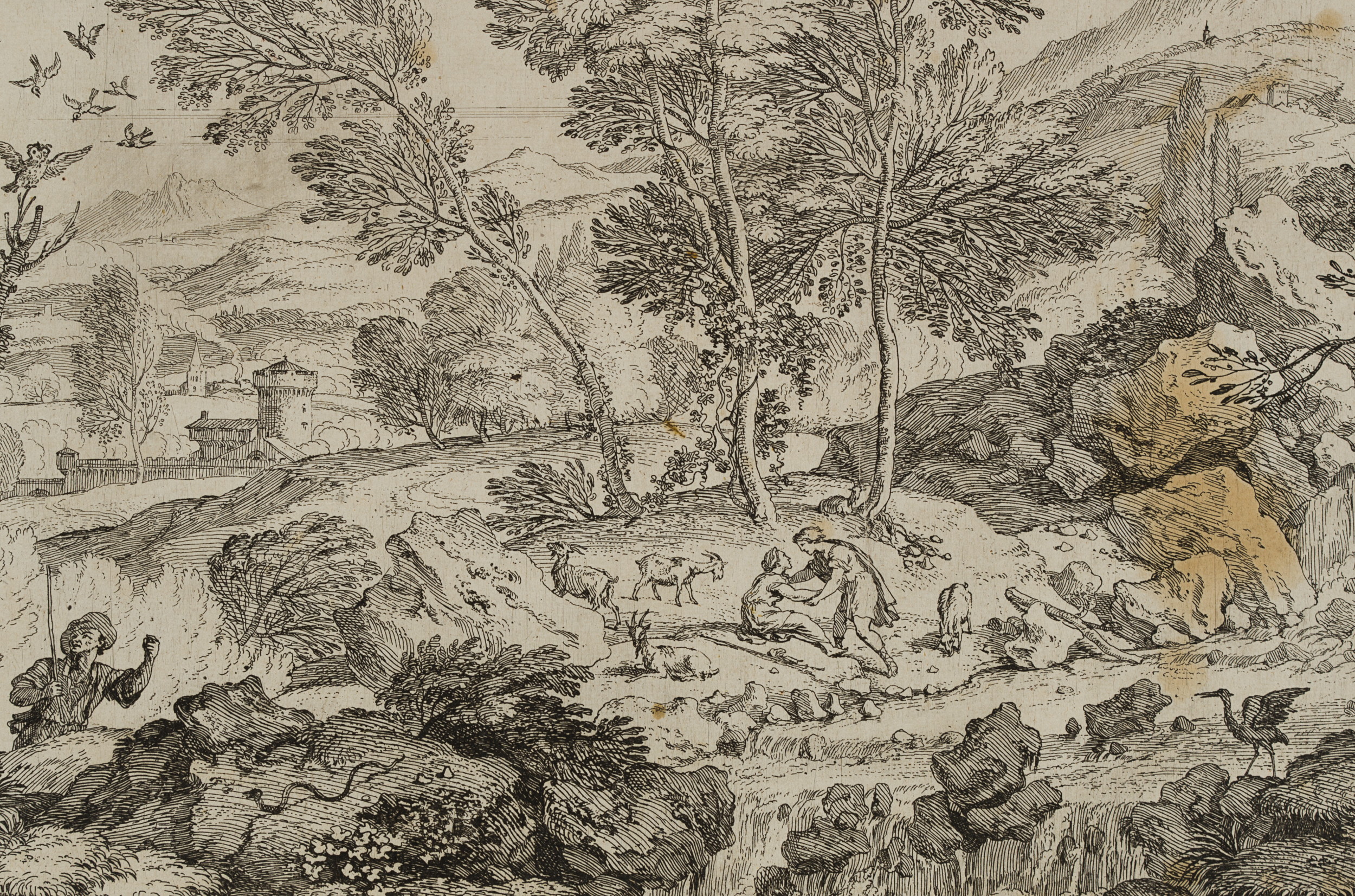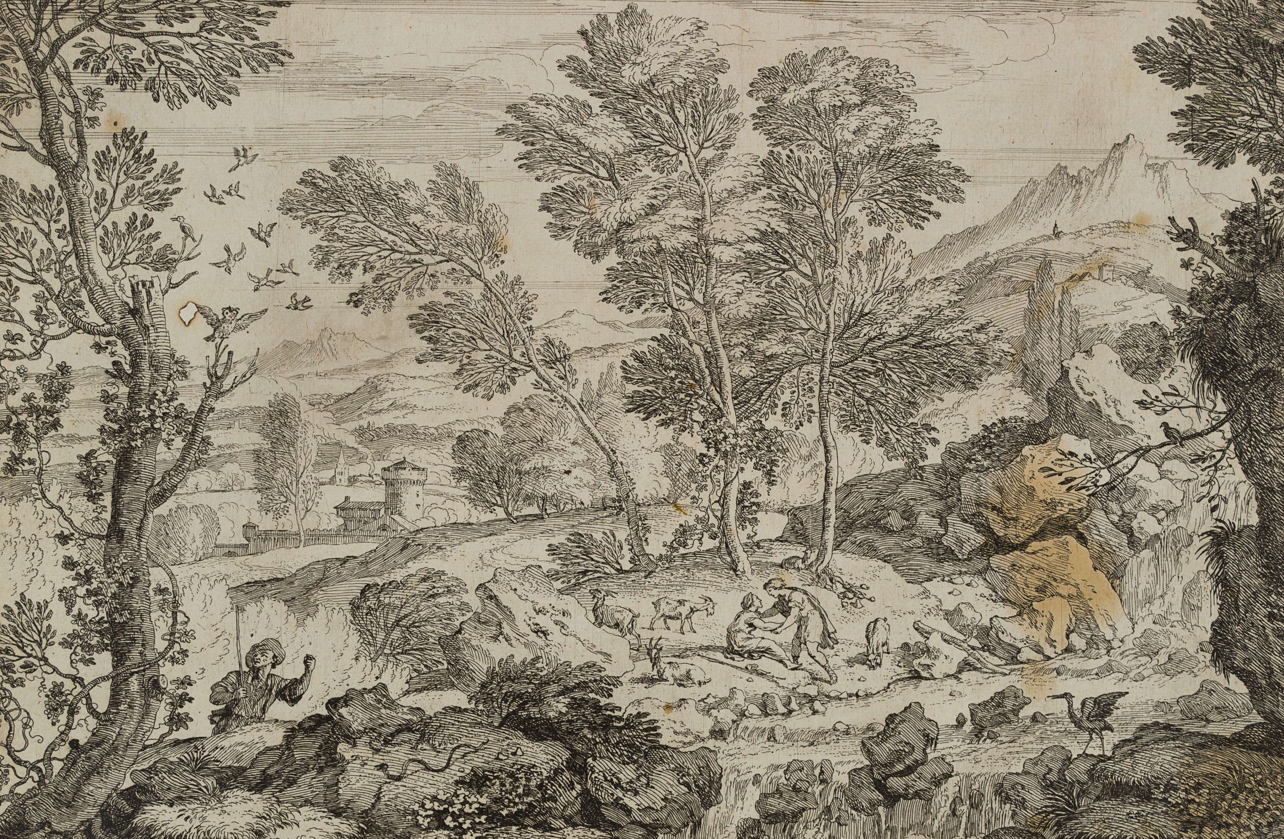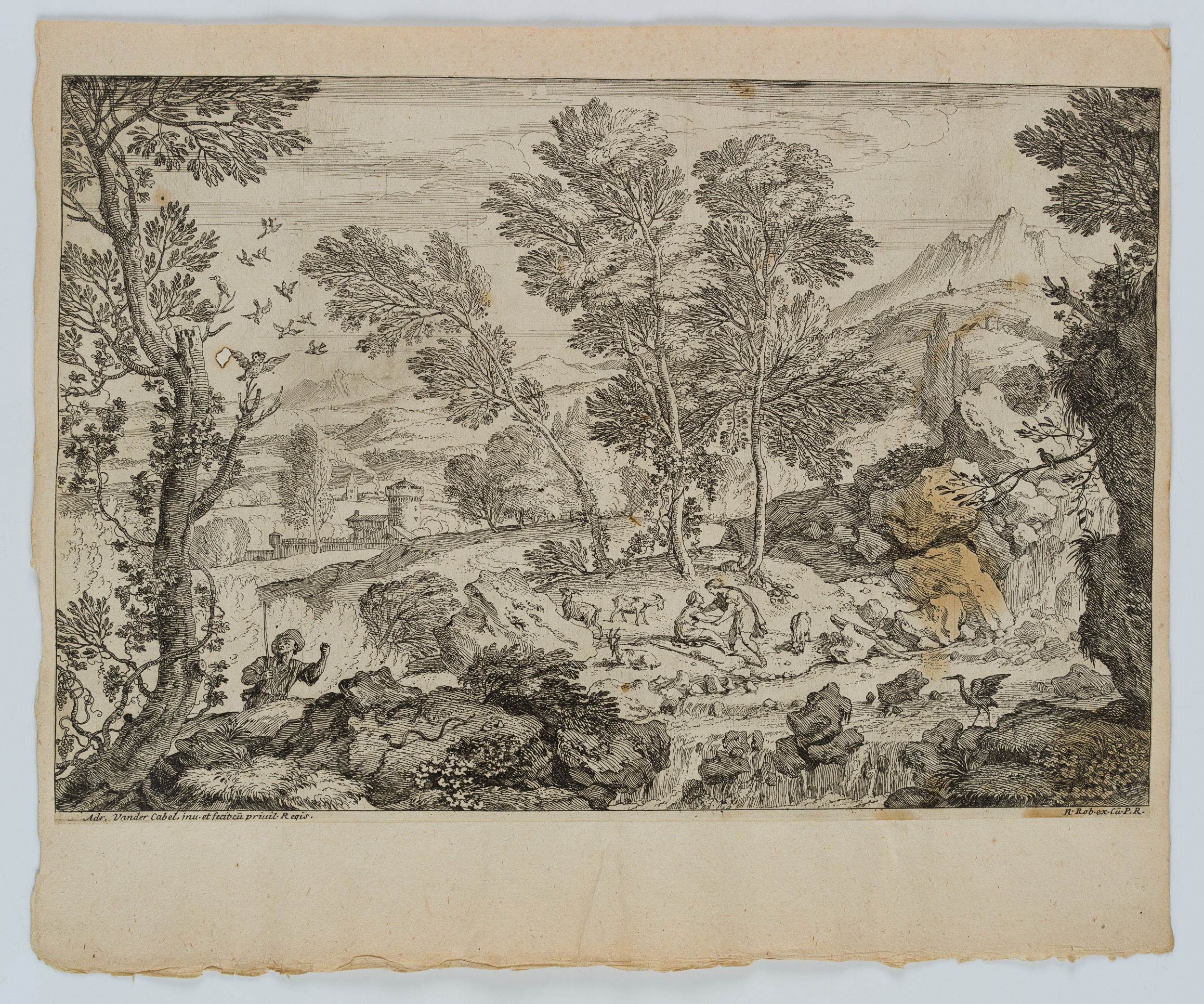 Adriaen van der Cabel (1630 – 1705 ), Pastoral landscape with shepherds, grazing goats and mountain ranges on the horizon, c. 1690, Etching