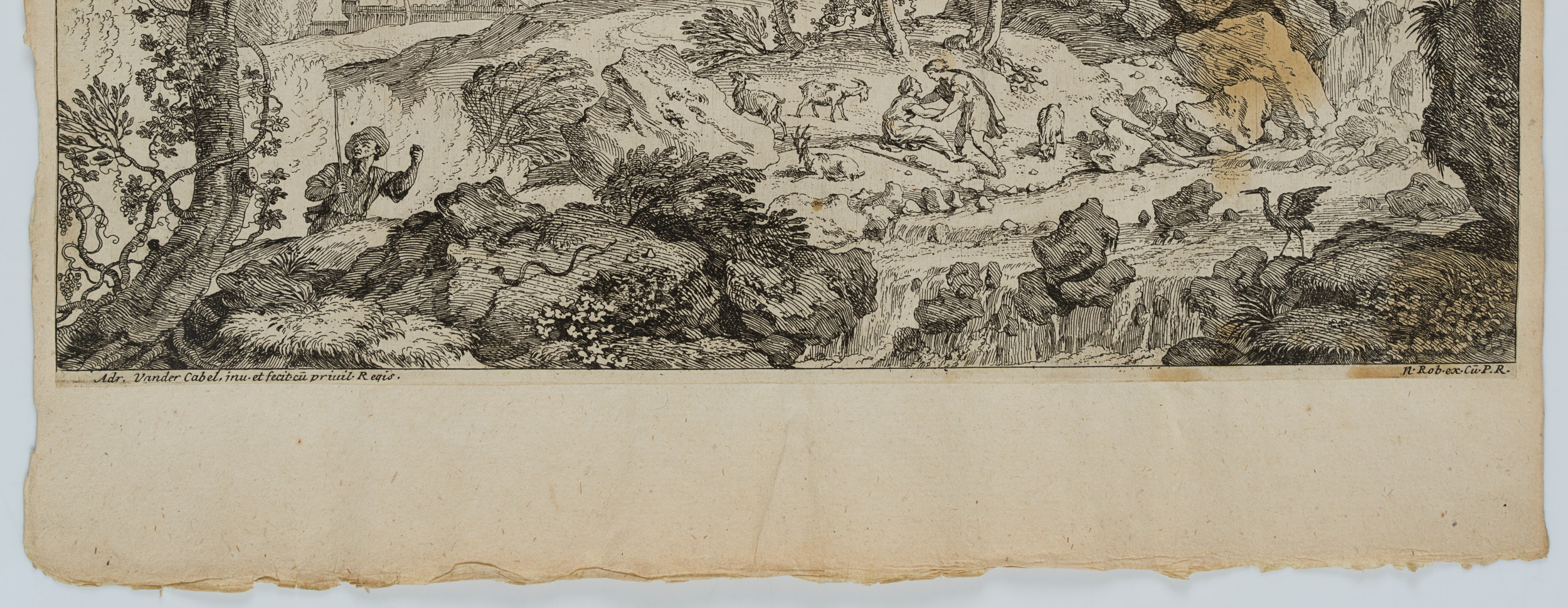 - Bezeichnung: Unten links im Druck signiert: “Adr Vander Cabel, inv. et fecit cu privil Regis”.