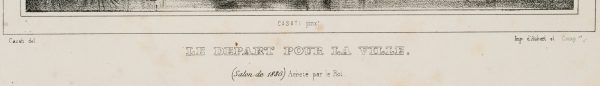 - Bezeichnung: Unterhalb der Darstellung signiert “Casati del. / CASATI pinxt. / Imp. D’Aubert et Comp. 1e.”, darunter in der Mitte in typographischer Schrift auf französisch betitelt und bezeichnet: “Le Depart pour la ville. / (Salon de 1836) Acheté par le Roi.”; oben rechts nummeriert: “No.39”.