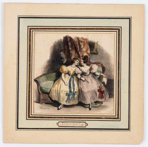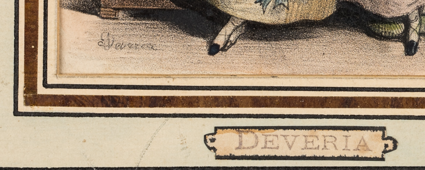 - Inscription: Signed “Deveria” on the left side of the image, below repeatedly inscribed “DEVERIA” in block letters. Mounted in a passepartout.