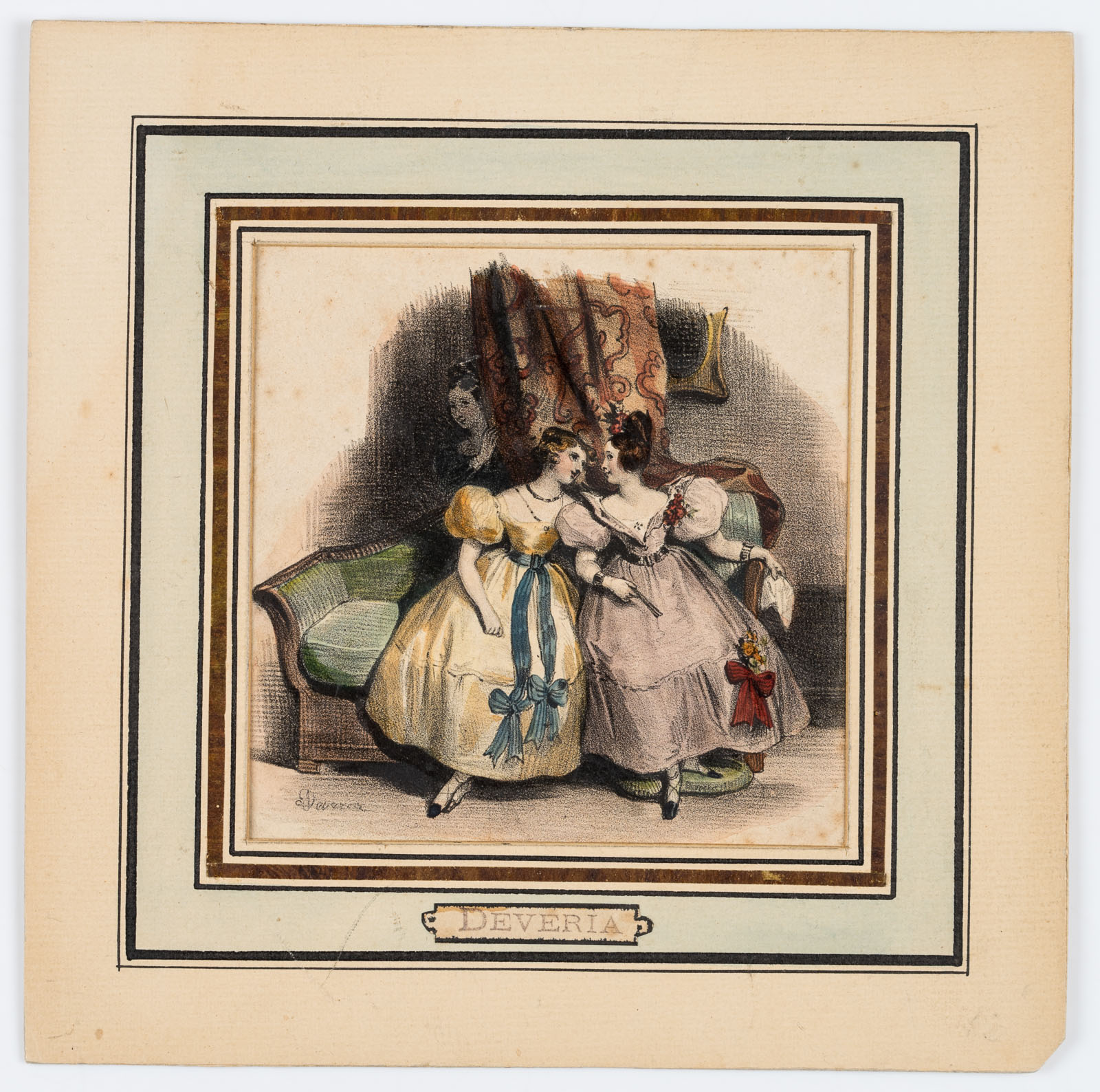 - Bezeichnung: Links in der Darstellung signiert mit “Deveria”, darunter in Druckbuchstaben wiederholt bezeichnet mit “DEVERIA”. In einem Passepartout befestigt.