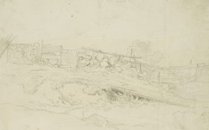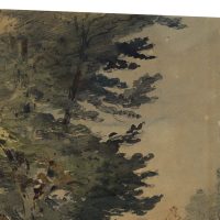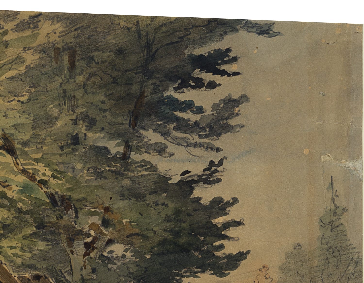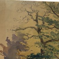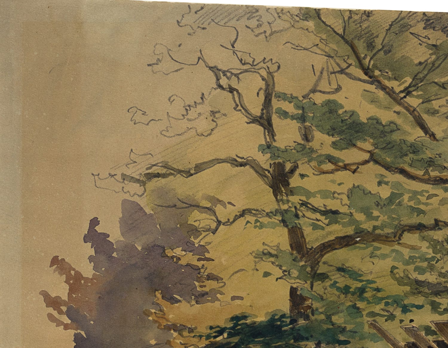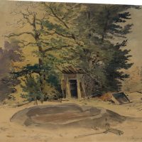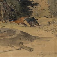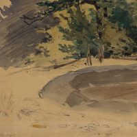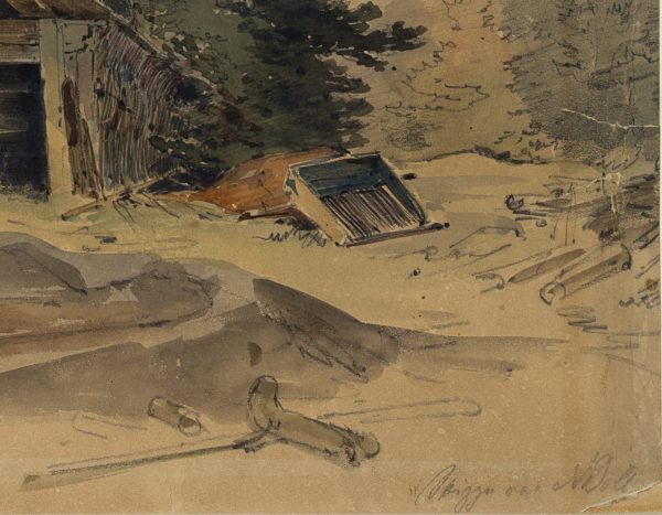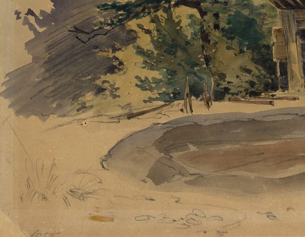 wachem Blick für einprägsame, zuweilen urwüchsige Szenen. Von solchen Streifzügen stammt auch dieses Aquarell. Es zeigt eine einsame Bretterhütte in einer Waldlandschaft neben einem Tümpel stehend. Der kleine Unterstand duckt sich unter das Laub zweier Bäume und scheint als Schuppen für einen Waldarbeiter oder Forstmann gedient zu haben. - Verso: Unkenntliche Skizzen